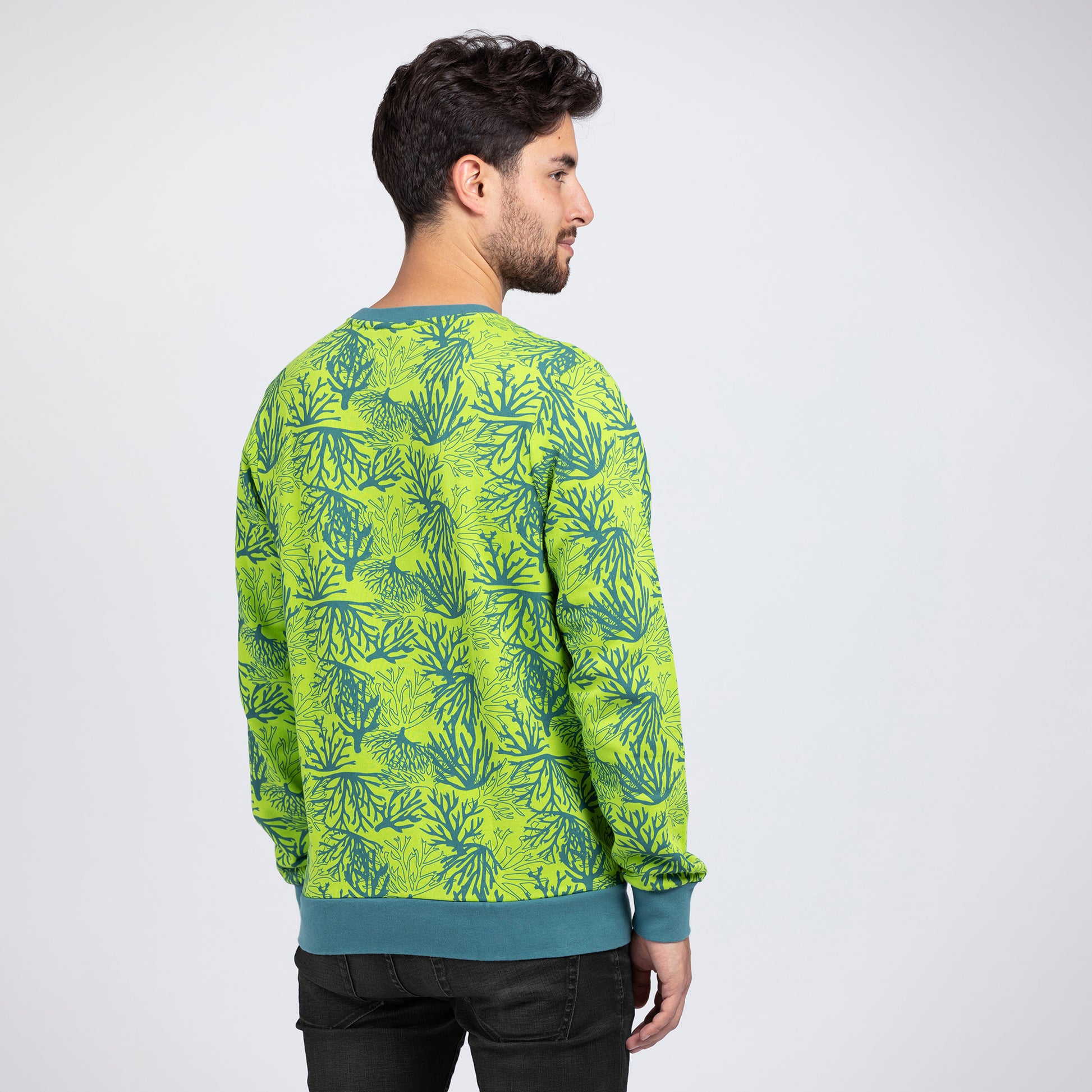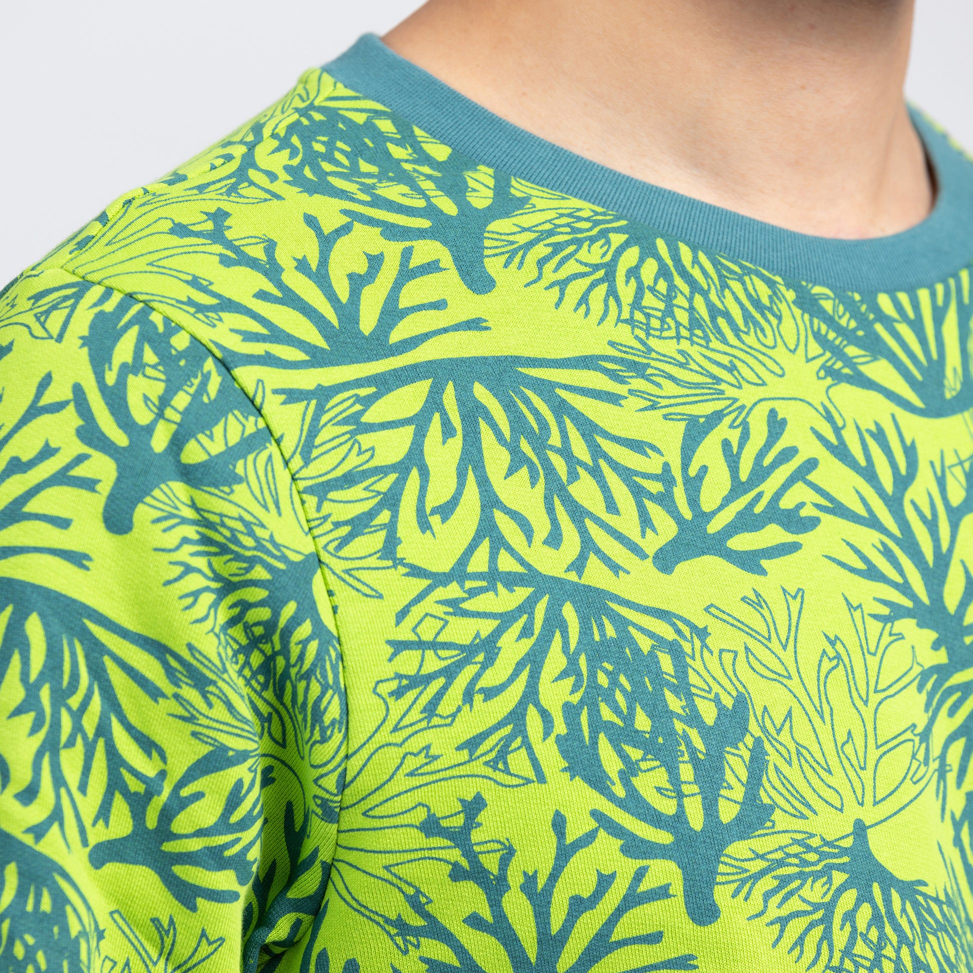 Langweilig war letztes Jahr. Dieses Jahr wird bunt, sportlich und gewagt. Unser neues, gerade geschnittenes Sweatshirt für Herren besticht durch seinen einzigartigen Korallen-Alloverprint in den Trendfarben Lime Green und Blue Spruce. Damit liegst du optisch ganz weit vorne. Viele kleine Details, wie die warm abschließenden, kontrastreichen Rippbündchen runden den Gesamteindruck ab. 280 g/m² Bio-Baumwolle halten dich schön warm. Der Stoff ist dicht gestrickt, innen angeraut, kuschelig-weich und robust, ohne schwer aufzutragen. Anziehen, Eindruck hinterlassen, nie wieder frieren. Das ist dein neuer Korallen-Sweater. 100 % bio, vegan, fair und nachhaltig. Made in Portugal.